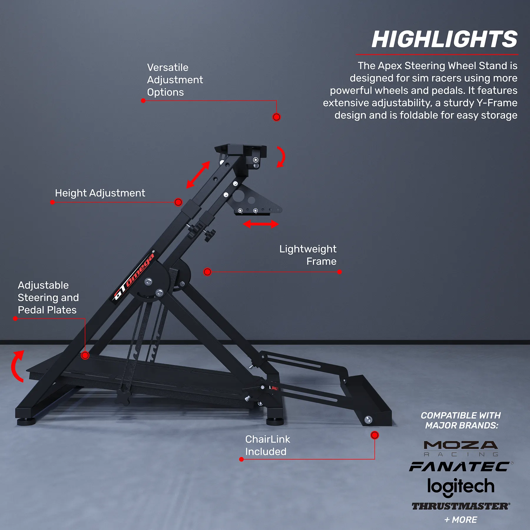 Bringing all the most loved features from our original model and some new sought-after design changes we have developed a wheel stand which meets the needs of any sim racing enthusiast.